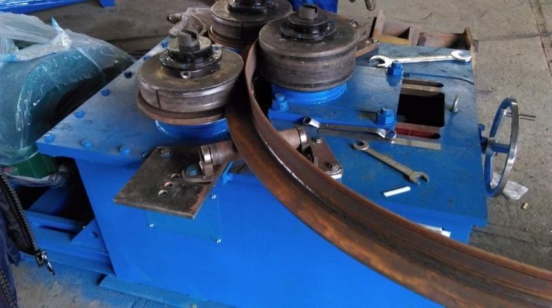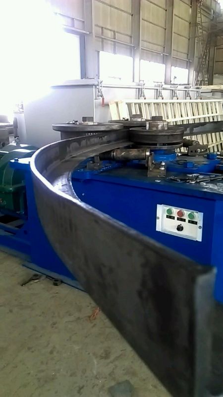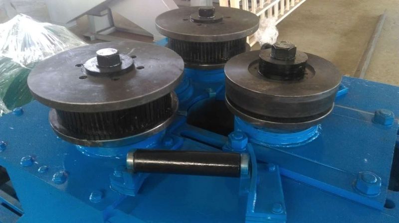 F6型卷圓機(jī)是對(duì)稱式三輥型材卷圓機(jī),集機(jī)電一體,將電動(dòng)機(jī)輸出的較高轉(zhuǎn)速通過(guò)傳動(dòng)裝置、聯(lián)軸器、減速機(jī)、齒輪等轉(zhuǎn)換為所需的大轉(zhuǎn)矩低轉(zhuǎn)速,帶動(dòng)位置固定的兩主動(dòng)輥實(shí)現(xiàn)旋轉(zhuǎn)運(yùn)動(dòng),為型材行走提供扭矩。被動(dòng)輥通過(guò)手輪前進(jìn)、后退實(shí)現(xiàn)位移,為卷制型材提供所需的加壓力,位移量由數(shù)字標(biāo)尺實(shí)時(shí)顯示。三個(gè)工作輥成等腰三角形分布,通過(guò)移動(dòng)被動(dòng)輥位置實(shí)現(xiàn)這三個(gè)點(diǎn)形成的弧線達(dá)到所需彎曲半徑,即調(diào)整所彎型材的曲率。借助被動(dòng)輥的壓緊及兩主動(dòng)輥的旋轉(zhuǎn)運(yùn)動(dòng),使型材經(jīng)過(guò)多道次連續(xù)彎曲,產(chǎn)生永久性的塑性變形,用于常溫狀態(tài)下將型材卷制成圓形、弧形、螺旋形等工件。